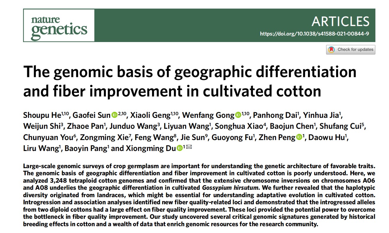近日,由我校beat365英国官网网站与中国农业科学院棉花研究所杜雄明课题组联合完成的研究成果《栽培陆地棉地理分化和纤维品质改良的基因组学基础》在世界顶级学术期刊《自然·遗传学(Nature Genetics)》在线发表,标志着我校高水平科研成果又取得一项新突破。中科院棉花研究所何守朴副研究员为该论文第一作者,杜雄明研究员为论文通讯作者;我校为该成果的第二完成单位,我校计算机学院孙高飞副教授为论文的共同第一作者。