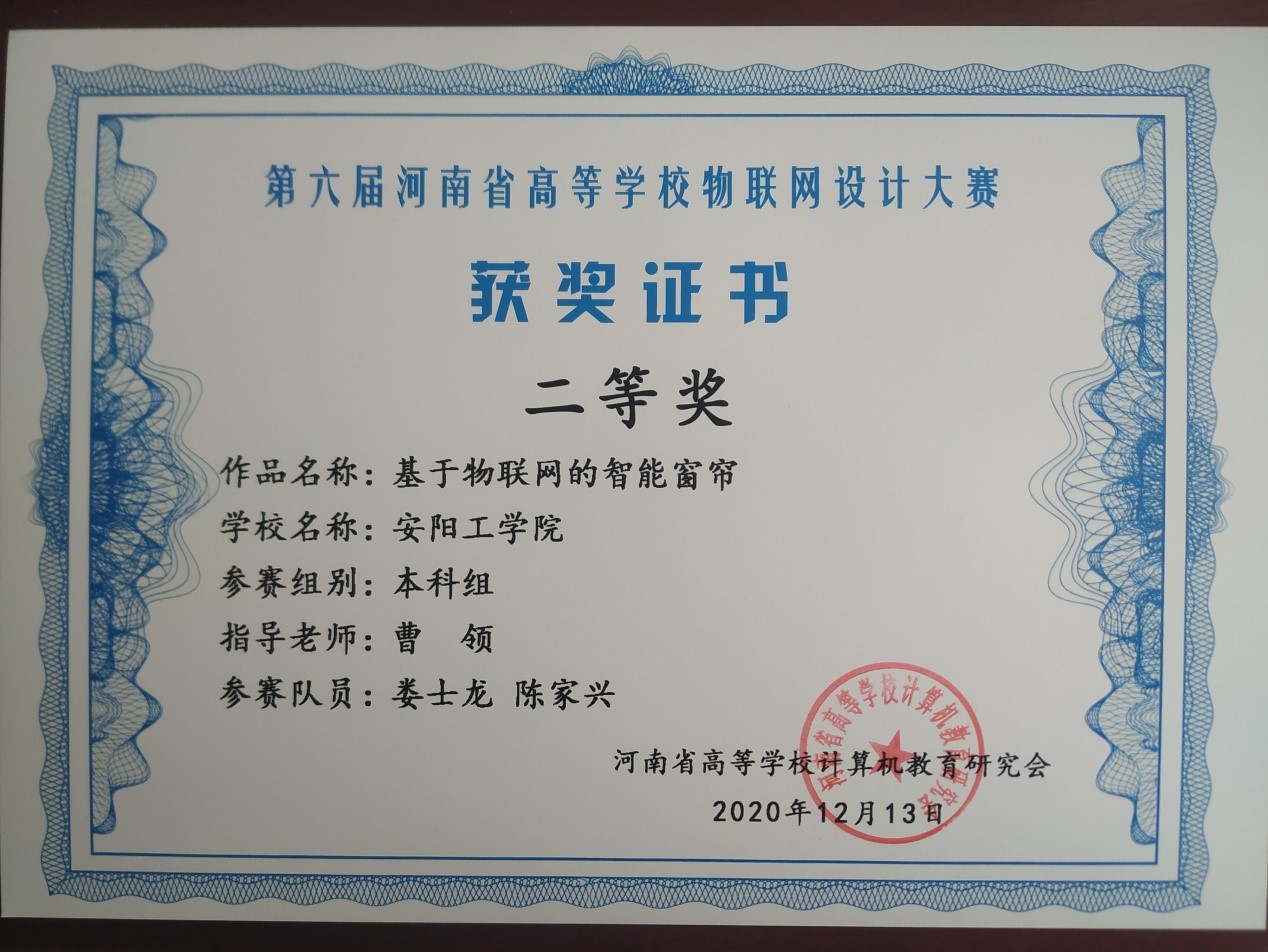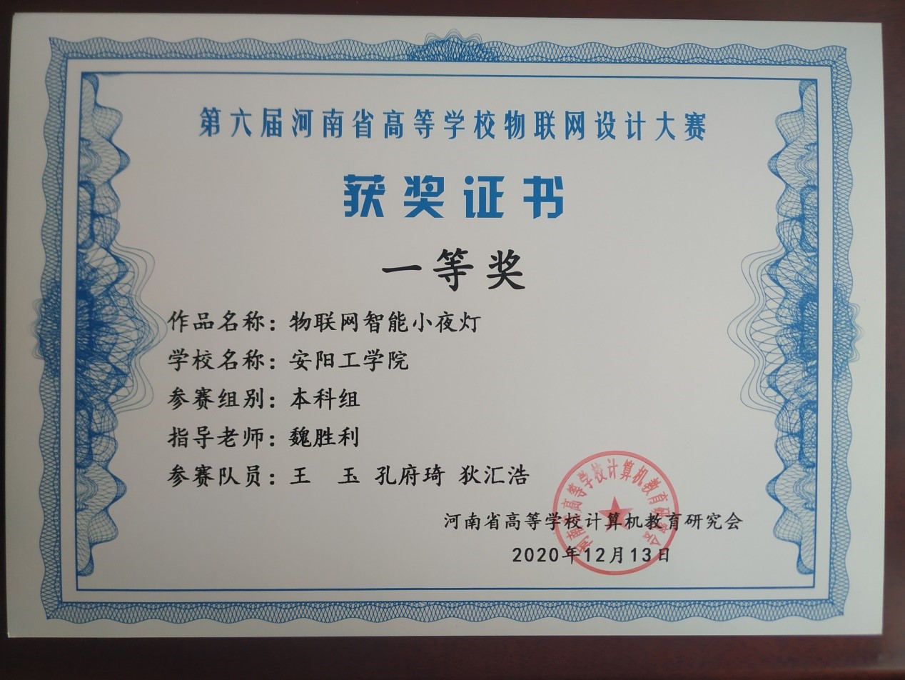 由河南省高等学校计算机教育研究会主办的第六届河南省高等学校物联网设计大赛于上周落下帷幕。此次大赛吸引了包括郑州大学、郑州轻工业大学、河南理工大学在内的二十多所高校参赛。经过线上作品展示与答辩,我校beat365英国官网网站物联网工程专业王玉等同学设计的“物联网智能小夜灯”获一等奖,娄士龙等同学设计的“物联网智能窗帘”获二等奖。