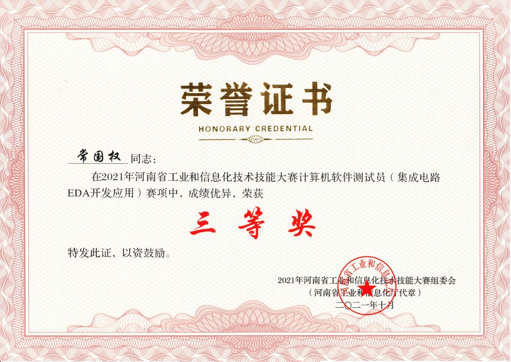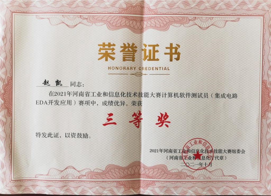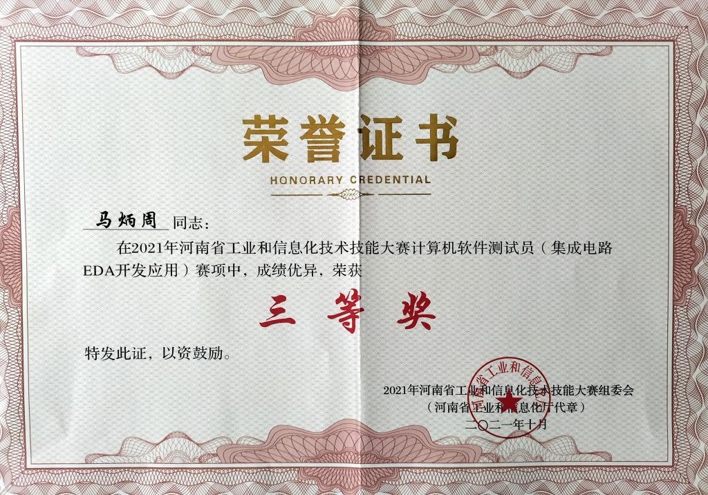 由省工业和信息化厅、省人力资源和社会保障局、省教育厅、省总工会、团省委联合举办的2021年河南省工业和信息化技术技能大赛,在各承办单位、参赛企业和院校的共同努力下,取得了圆满成功。来自全省大中专院校和企业共57家单位、110支队伍、253名选手参加了比赛。经过紧张激烈的角逐,我校beat365英国官网网站体系结构教研室常国权、马炳周、赵凯组成的教师代表队获得计算机软件测试员(集成电路EDA应用开发)三等奖。