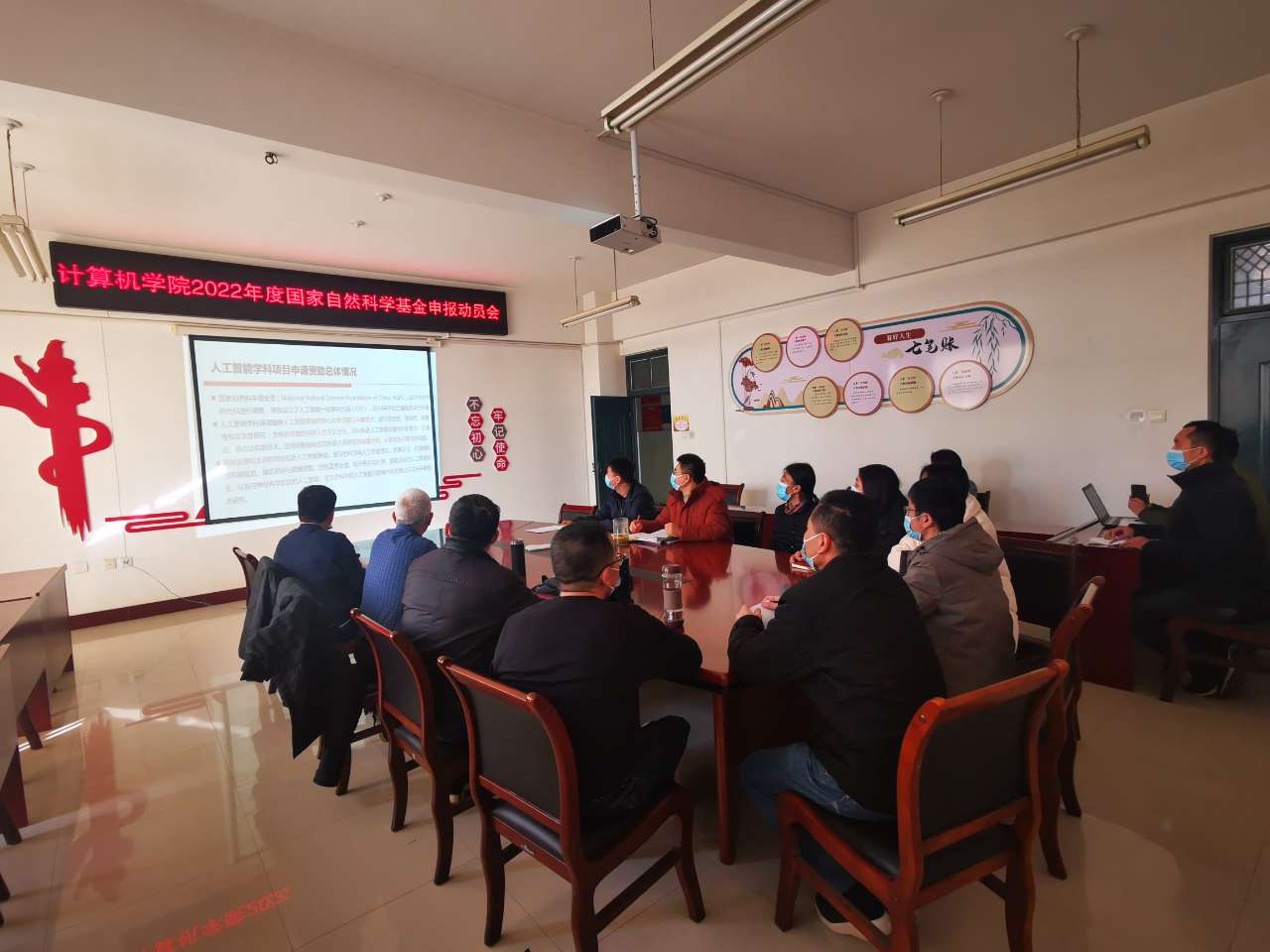 11月25日上午9:00,计算机学院在A06-309组织召开了2022年度国家自然科学基金申报动员会,并成立了以学院院长、科研副院长、具有博士学位教师、副教授及以上职称等科研骨干组成的高级研修班。副校长万鹏杰和科研处处长张勇亲临院部巡查观看情况。