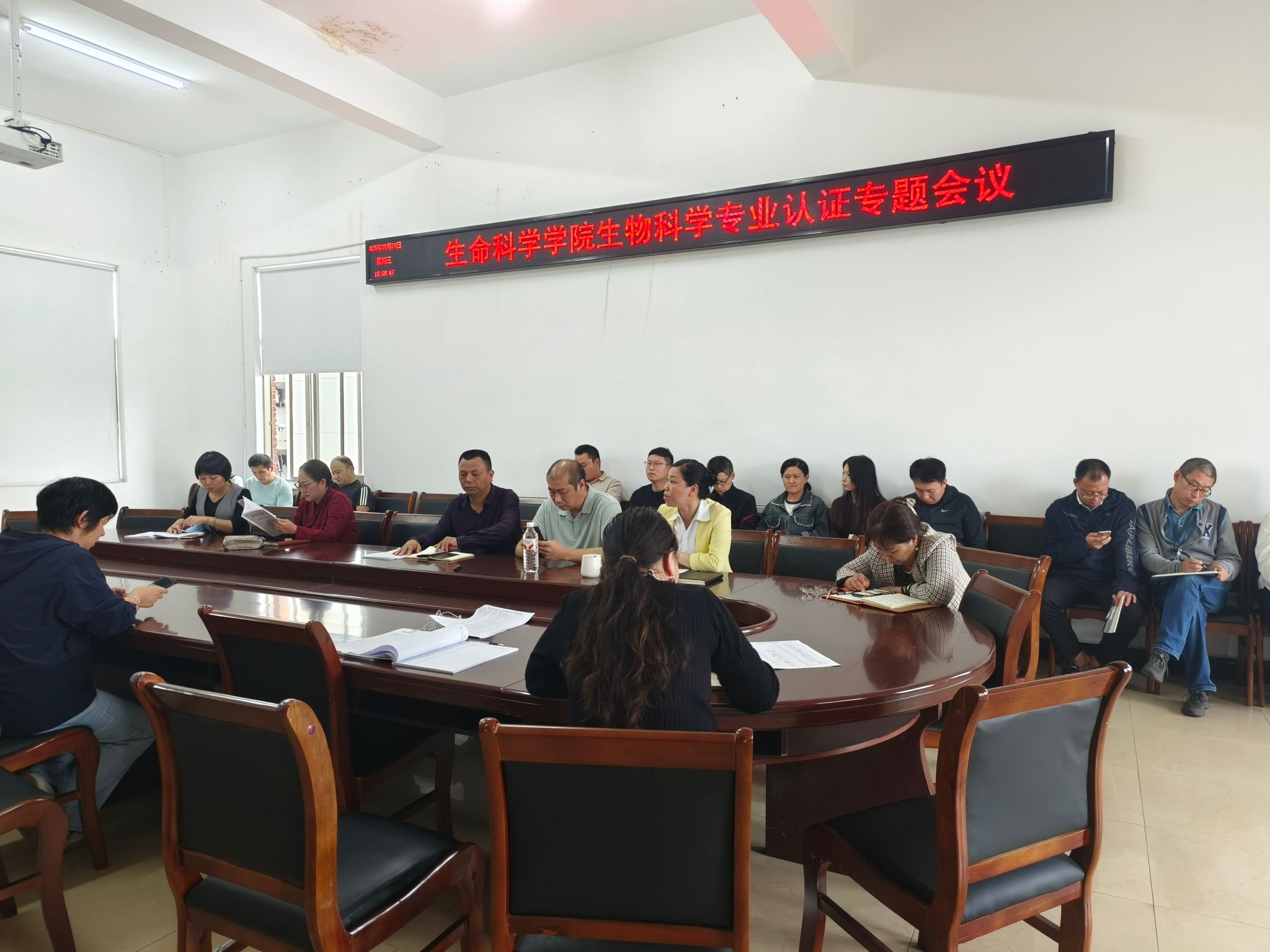 9月24日下午3点,beat365英国官网网站生物科学专业认证专题会议在西校区计算机楼401会议室顺利召开,全体教职工参加了此次会议。会议由曹丽敏书记主持,她首先介绍了会议流程并要求全体教职工保持良好的工作状态和高度的责任心做好本职工作及学院安排的临时性工作,充分发扬主人翁精神,接下来,系主任唐兴对专业认证的主体报告向与会人员做了详细汇报,紧接着,杨海副院长就认证工作相关要求及认证知识点做了辅导报告,最后易诚院长代表学院作认证报告,为确保高效完成工作任务,老师们展开充分交流与讨论,总结发言时,易院长再次对与会人员提出工作要求,希望大家戮力同心,圆满完成工作。