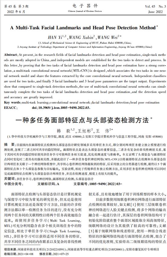 2022年6月beat365官网韩毅老师在中文核心期刊电子器件发表了题为《一种多任务面部特征点与头部姿态检测方法》文章,该研究针对:目前国内在面部特征点检测和头部姿态估计研究领域多采用单任务方式,即分别对两项任务建立独立模型进行检测处理,忽视了二者之间可共享的隐层特征,面部特征点是表达头部姿态的重要信息,二者含有复杂的非线性映射关系。基于其间可共享的隐层特征使用多任务学习可使两任务相互促进,优化检测速度与准确率。本研究证明了头部姿态与面部特征点同时变化时二者具有的强相关性,并据此设计了一种多任务卷积神经网络(MTL-CNN)以将面部特征点检测和头部姿态估计两项任务关联于一个神经网络模型中共享核心卷积神经网络提取到的特征,后采用独立的分类器进行检测,最终以5个面部特征点和3个头部姿态参数为目标输出。研究表明相比于传统单任务独立检测方法,采用多任务卷积神经网络可以同时完成面部特征点检测与头部姿态估计两项任务并且在检测速度、精度上有较大的提升。